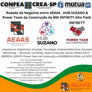 Rodada de Negócios entre AEAAS , HUB SUZANO & Power Team da Construção do BNI INFINITY Alto Tietê …Arquitetura, Engenharia, Inovação, Tecnologia, Empreendedorismo, Business, Networking … Parcerias, Convênios, Ações Conjuntas, Núcleo AEAAS SÓCIO EMPRESA, EVENTO